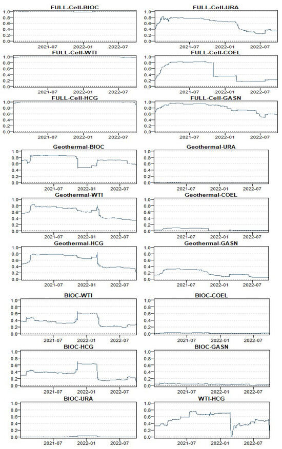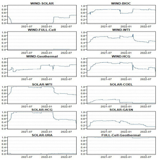 FUEL-CELL/WTI has the highest hedging efficacy, about 78%, while the lowest connection is BIOC/GASN. The findings presented in Table 5 indicate that investing in non-conventional energy is always less profitable than hedging positions through a dynamic hedge ratio and effective hedge strategies. The highest level of effectiveness is observed in the FULL-Cell/WTI connection, which is approximately 78%, while the lowest level of effectiveness is observed in the BIOC/GASN pair. These results demonstrate that the most optimal strategies employ the cheapest hedges, which is typically the most effective hedging strategy. Our findings align with prior studies [37,64]. In addition to the points above, the dynamic optimal hedging weights and ratios are illustrated in Figure 4. The presented visualization provides further evidence, highlighting the significant ability of clean energy to mitigate risks compared to traditional energy markets. The evident correlation between clean energy and its capacity to serve as a reliable safeguard against conventional energy sectors is underscored in the illustrated patterns, strengthening the strategic importance of incorporating clean-energy assets into diversified portfolios.