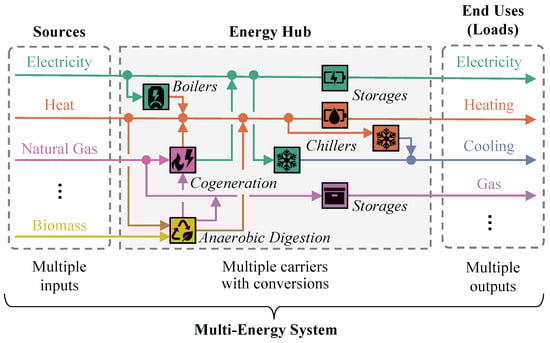 To meet climate action targets and provide reliable energy services for all, it is advantageous to recognize opportunities to interconnect multiple energy carriers through multi-energy systems (MES) with energy hubs (EH). Visualized in Figure 1, MES are integrated energy systems that simultaneously manage, convert, and distribute two or more energy carriers—such as electricity, heat, gas, or hydrogen—through interconnected networks and EH to improve efficiency, flexibility, and reliability. The scale, energy carriers, and equipment can vary significantly based on community needs. By integrating heterogeneous energy carriers, MES can achieve zero-carbon goals via deep renewable energy penetration and waste heat recovery [4]. Beyond decarbonization, MES can also provide financial and social benefits to communities by enabling pathways to integrate local resources, increase energy autonomy, and leverage economies of scale benefits through aggregation and resource sharing (e.g., higher systemic energy efficiencies through aggregation).