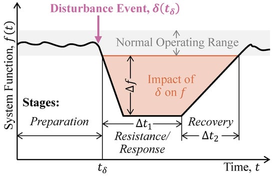 While the specific definitions and metrics for resilience vary across application domains [13], the fundamental concept can be explained through Figure 2. The three general classification stages of resilience include (1) Preparation, (2) Resistance and Response, and (3) Recovery. These three stages are consistent across numerous literature sources [13,14,15,16]; although, the exact terms can vary slightly, and the Resistance and Response stage is at times further divided into two. In the first stage, corresponding with normal operation, the system can prepare for a future disturbance event occurring at time . This event can exhibit various levels of intensity, frequency, and predictability. Following the event, the time-varying system function is pushed outside of its normal operating range. To return to normal operation, the system wants to resist the disturbance (limit ), respond quickly (limit ), and recover quickly (limit ). Generally, the shaded area under the curve represents the impact of on f; this is referred to as the total stability [8] (e.g., ecological context) or simply the resilience [16] (e.g., power systems context).