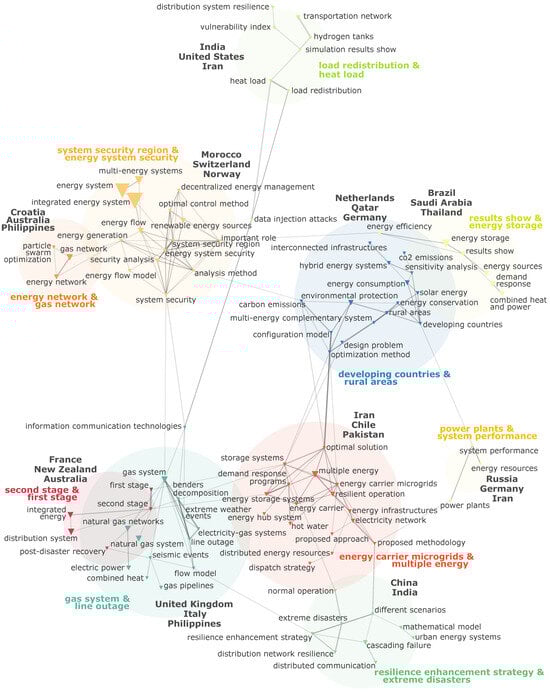 Further clustering the top 100 terms as a homogeneous network map, Figure 5 depicts ten thematic categories, their interrelationships, and common terms within and spanning each cluster. The three largest clusters by number of terms are “energy carrier microgrids & multiple energy” (16 terms), “system security region & energy system security” (15 terms), and “developing countries & rural areas” (15 terms). While the remaining analysis focuses on specific technical aspects, the bibliographic results here give a valuable picture of unbiased themes and common content across the full database.