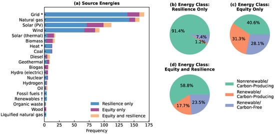 Adoption of (a) source energy types (20 most frequently occurring) and (b–d) energy class for decarbonization goals with documents focusing on (b) resilience only, (c) equity only, and (d) equity and resilience. In (a), energies with * are not primary sources (primary sources not specified in text). Energies with † are generic categories given in text without further details.