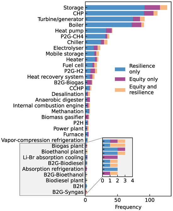 Spanning both equity and resilience perspectives, 31% of studies integrated sector coupling via power-to-X or biomass-to-X processes into the system design. Of all variants, power-to-gas with the gas as CH4/natural gas was most common (), followed by power-to-gas producing H2 (). Studies also captured heat through power-to-heat [67,97] and biomass-to-heat [98,99] processes, which may have been wasted otherwise. Across all biomass-to-gas studies (), the “gas” included biogas [81,98,100], biodiesel [98,101], syngas [102,103], and others [98,99,101], such as bioethanol, biochar, glycerol, and methanol.