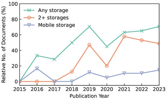 Further, the relative number of documents that include storage are increasing over time (Figure 8). Since the number of publications per year started increasing in 2015, the percentage of papers including either (1) any storage or (2) two or more storages has increased over time. For documents published in 2023 (), 71% included storage, while 49% included two or more storage types. Prior to 2018, no documents included more than one storage type. Mobile storage has not seen significant growth to date and is included in 7.7% of the documents on average.