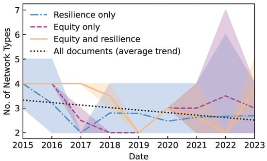 Number of network types included in each case study. Lines are annual averages for each category. Shaded regions are the annual minimum and maximum for each category. The dashed black line is the linear fit of the annual average number of networks for all categories.