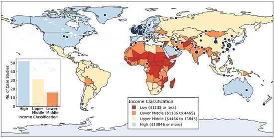 Geographical locations of case studies with respect to country-level economic statuses, with larger circles indicating a higher number of studies at a given location. Low-income countries are not represented in the studied literature.
