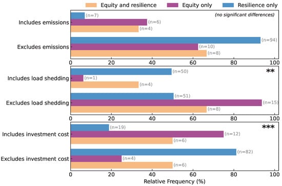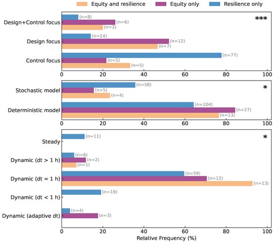 Among the differences, three modeling aspects diverged between equity and resilience lenses with statistical significance, as shown in Figure 11. Specifically, resilience only papers tended to focus on control actions, while equity only papers centered around design (highly significant, ). Equity papers tended to be deterministic, while stochastic modeling was statistically more prevalent with resilience only papers (weakly significant, ). Lastly, equity papers included dynamic models with adaptive time step solvers more frequently than expected, while a one-hour time step dominates the body of literature (weakly significant, ). Uniquely, one work [61] implemented dynamic models discretized across state-space rather than time, obtained via Laplace transform, which enabled reasonable approximations of high frequency power system dynamics alongside low frequency gas dynamics. Similarly, the adaptive time-step solvers that a few works adopted [115,116,117] produces comparable computational benefits for stiff mathematical problems, such as common with MES.