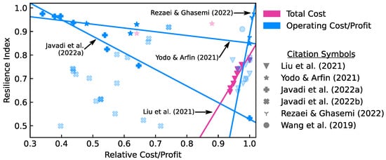 Beyond static storage equipment, 21 papers leveraged mobile storage (e.g., trucks, buses, electric vehicles) to allow fewer resources to access more locations. Mobile storages were implemented independently of resilience and equity scopes. Of studies with mobile storage, electric vehicles were most common () [89,90,91], followed by plug-in hybrid electric vehicles () [77,92,93] and hydrogen gas trucks () [70,94,95]. Finally, two papers used more than one type of mobile energy storage. Sui et al. [86] implemented electric, ice, and water mobile storages in a post-disaster self-sustaining operational strategy for islands, while Tao et al. [96] evaluated the vulnerability of MES involving fuel cell vehicles and plug-in hybrid electric/hydrogen vehicles.