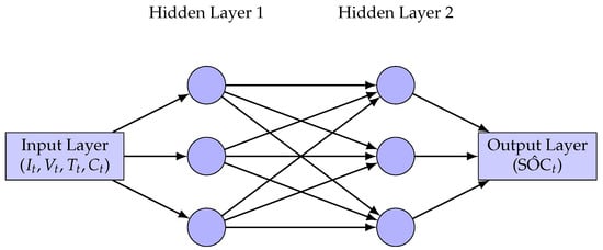 Simplified architecture of the feedforward neural network (FFNN) used for SOC estimation, illustrating input, hidden layers, and output.