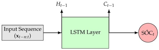 Unlike the stateless FFNN, the LSTM processes a sequence of past where each represents the input features at time i. The LSTM estimates SOC by learning from the complex temporal dynamics: