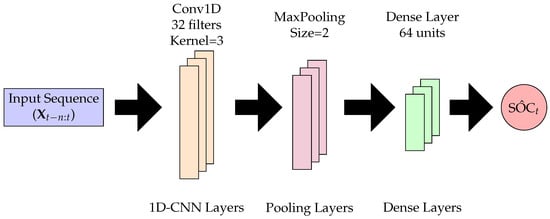 This architecture is particularly capable of identifying short-term passings and characteristic signatures within the operational data of the battery. Given a multivariate time series input , the 1D-CNN executes a series of convolutional and pooling operations, followed by dense layers, to output the SOC estimate: