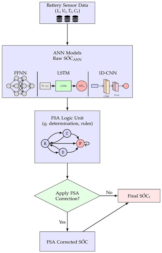 The core innovation in this framework lies in improving the robustness and physical consistency of SOC estimation. It is done by dynamically integrating each of the three ANN models with an FSA. The FSA continuously tracks the operational mode of the battery and applies logical consistency checks. It either modifies or validates ANN-based SOC predictions according to the current system state. This merged framework serves as a post-processing filter, ensuring that outputs stick to known physical behaviors (Figure 6).