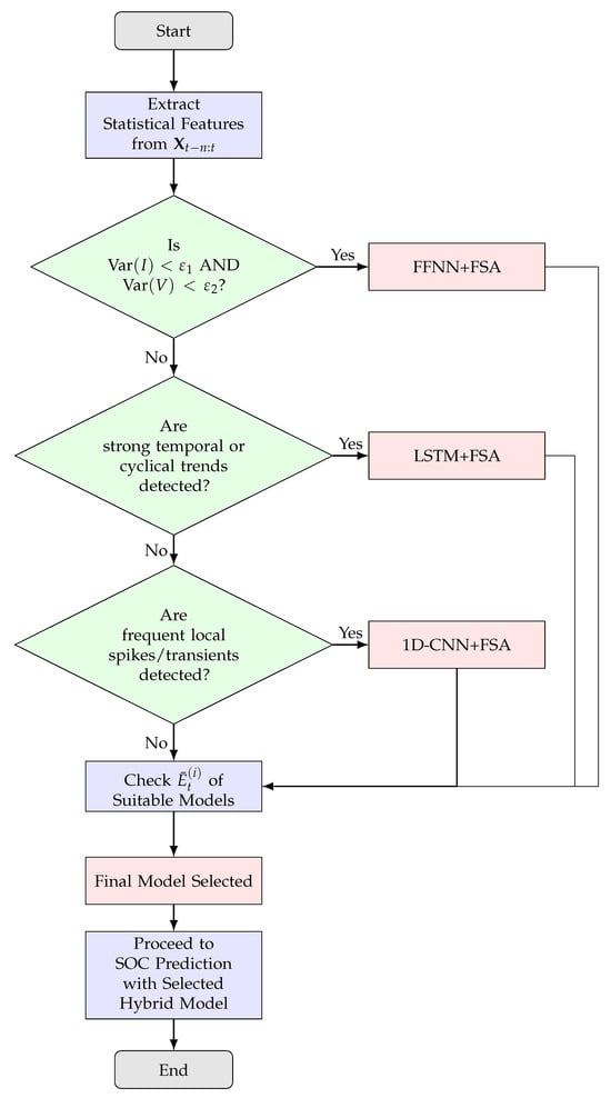- If input shows frequent local spikes or short-term transients (e.g., sudden current spikes during dynamic loads or regenerative braking): The 1D-CNN+FSA model is selected. Moreover, 1D-CNNs are better at identifying and processing localized patterns and rapid changes within time-series data. This aspect is making them robust to noisy or rapidly unstable inputs. This is particularly important during scenarios with large temperature fluctuations or sudden load changes, where the 1D-CNN’s feature extraction is more effective at discerning these local anomalies.