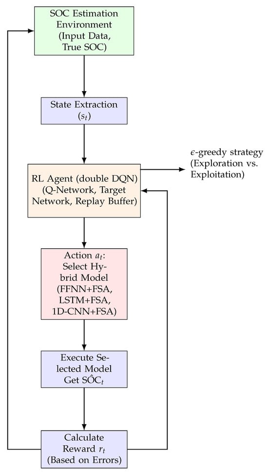 Similarly, Ref. [26] proposed a dual-stage attention-based bidirectional recurrent neural network (RNN) with physics-informed components, achieving improved generalizability and accuracy. In the domain of reinforcement learning for battery management, recent studies have framed SOC estimation as an RL problem, leveraging architectures like proximal policy optimization (PPO) to develop robust and accurate models that adapt to diverse operating conditions [27,28]. Deep reinforcement learning has also been proposed for SOC estimation and management of nickel–metal hybrid batteries, showing high accuracy and faster convergence compared to state-of-the-art models by incorporating various parameters like route type and environmental conditions [29]. These RL-based approaches underline adaptive learning through interaction with simulated environments, and also enhance performance under various operational situations. Regarding dynamic model selection in battery applications, some studies utilize machine learning models to predict battery capacity or state of health [30,31]. Studies of hybrid models for SOC estimation demonstrate that traditional models integrated with neural networks can achieve high-precision and robust predictions under complex conditions. These hybrid systems also highlight their ability to overcome the limitations of traditional methods.