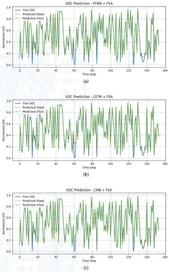 LSTM+FSA models can still accumulate errors or produce physically unstable SOC jumps during sudden state changes (e.g., a rapid Charging-to-Rest transition or an unexpected discharge event). However, it is highly effective in processing temporal correlations due to its memory mechanisms. To smooth LSTM estimations and position them with physical expectations, the FSA is used to restrict or adjust predictions, especially when the raw output of LSTM suggests a physically implausible SOC change (e.g., a sudden increase in SOC during discharge). The FSA actively monitors transitions for unexpected conditions from arising, such as Charging → Fault. And also, it applies smoothing filters based on the current mode, preventing nonphysical deviations. For example, if the temperature or voltage exceeds safe limits during fast charging, the FSA immediately flags a ‘Fault‘ state and adjusts the SOC prediction, preventing potentially dangerous and physically impossible extrapolations.
