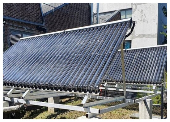 The solar thermal collectors installed at the University of Paris Nanterre (Figure 2) connected to the absorption system (Figure 3) are evacuated tube collectors of the heat pipe type, certified with a valid CSTB Technical Approval and Solar Keymark certificate covered by a ten-year “good performance” guarantee. They are heating pipe vacuum tube types with a selectively coated metal absorber with a dry type of collector/heat pipe connection and a copper collector (1 inlet/1 outlet) on either side of the sensor, installed on supports inclined at 30° from the terrace roof. The characteristics of each collector are η0 = 0.683 (optical efficiency), a1 = 1.37 W/m2. K (first-order heat loss coefficient), a2 = 0.0041 W/m2. K2 (second-order heat loss coefficient) for an entrance surface of 3.26 m2. The efficiency can then be estimated using the following expression where is the average fluid temperature in the collector, refers to the ambient temperature and represents global solar irradiance on the collector surface.