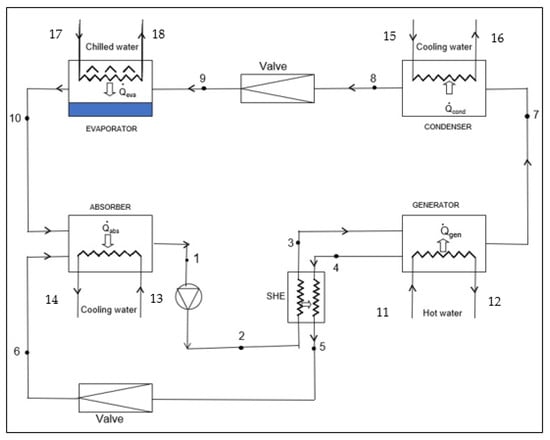 Schematic of the absorption cycle with operating thermodynamic states (from 1 to 18).