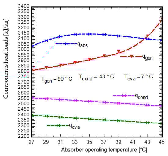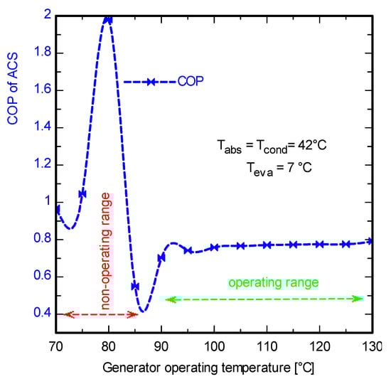 Based on the analysis presented in Figure 17, several design improvements can be considered to enhance the overall performance and stability of the absorption cooling system. One key recommendation is the implementation of a generator equipped with advanced heat transfer surfaces, which can significantly improve thermal efficiency by enhancing the heat exchange between the heat source and the working fluid. Additionally, the adoption of hybrid cooling systems for the absorber is proposed to optimize heat rejection, especially under fluctuating ambient conditions. These enhancements contribute to a more robust and efficient absorption chiller design suitable for real-world operating conditions.