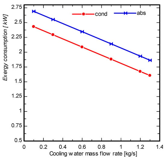 It was observed that when the cooling water flow rate increases from 0.2 to 1.4 kg/s, the exergy consumption of the two components is reduced by 36% due to the decrease in the temperature pinch.
