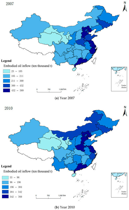 In 2007, while embodied oil inflows were still relatively dispersed spatially, coastal provinces such as Guangdong, Jiangsu, and Zhejiang already demonstrated significantly higher inflow levels due to energy demand from their manufacturing boom.