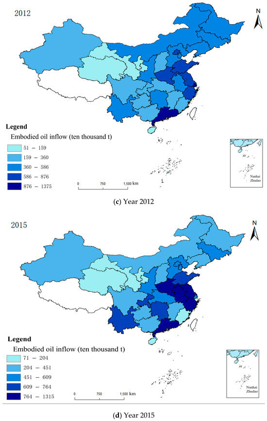 By 2010, embodied oil inflows continued to expand in eastern coastal regions, while central provinces such as Henan emerged as new growth poles. This shift mirrored central China’s economic rise and industrial–consumption synergy, strengthening their role in the national energy landscape.