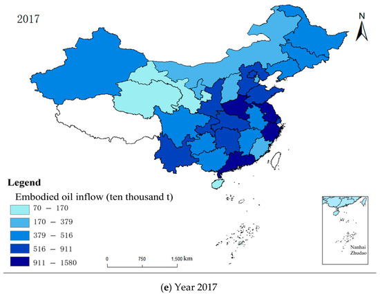 In 2017, spatial divergence intensified further: core provinces of Guangdong, Jiangsu, Zhejiang, and Henan dominated embodied oil inflows, substantially outpacing others, while several western regions maintained stable but minimal levels.