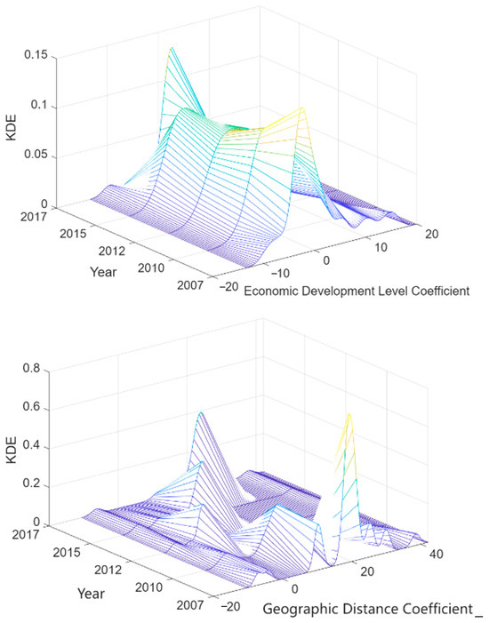 Geographic distance predominantly exerted positive effects on embodied oil flows, as shown in Figure 4. The coefficient distribution evolved from a multi-peak pattern in 2007 to a single-peak concentration in 2017. In 2007, the highest peak occurred at 19.7, indicating that for most provinces, each unit increase in geographic distance corresponded to a 19.7-unit rise in cross-provincial embodied oil inflows. Secondary peaks were observed at 10.2 and 25.2. In 2017, the peak value rose to 24.0. Compared with 2007, this indicates that a one-unit increase in geographic distance led to a 24.0-unit growth in cross-provincial embodied oil inflows for most provinces. These findings demonstrate a persistent intensification of distance effects over the decade, highlighting the growing significance of transportation-related oil consumption in interprovincial trade.
