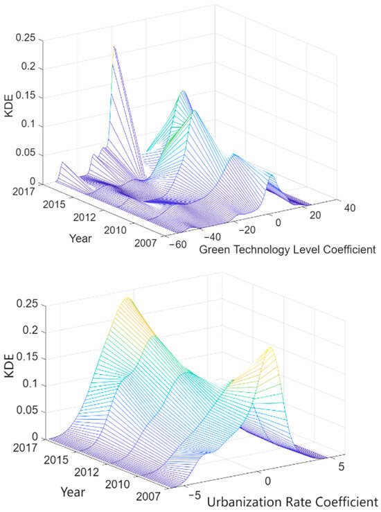 This study employs Kernel Density Estimation (KDE) [30] to visualize the distribution dynamics and evolutionary trends of variable coefficients, revealing temporal variations in how key factors influence consumption-side embodied oil flows in China.