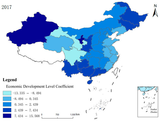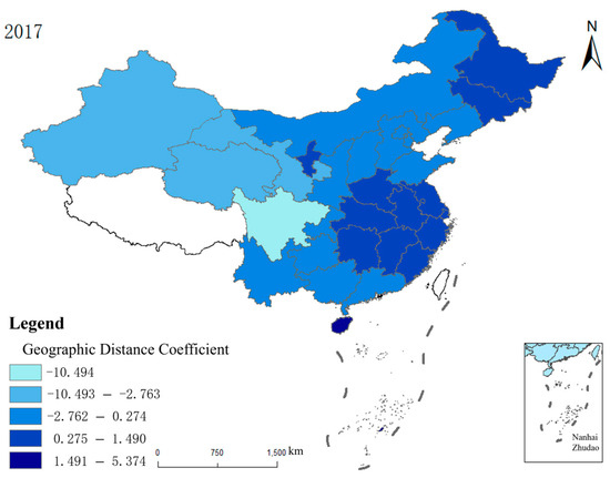 The year 2017 marked a pivotal stage in China’s supply-side structural reform, witnessing significant economic restructuring that substantially altered the spatiotemporal patterns of embodied oil flows. We select 2017 for its representativeness and data availability, as it is the latest year with complete interprovincial input–output tables. Using ArcGIS, we visualize the GTWR model coefficients and analyze spatial heterogeneity by mapping province-specific regression coefficients.