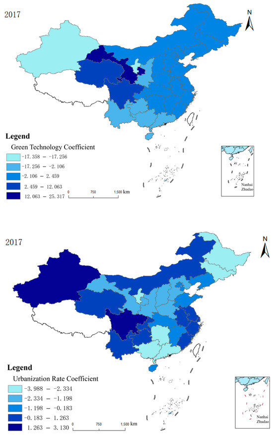 Spatial distribution of green technology level and urbanization rate coefficients affecting embodied oil flows across China’s 30 provinces. Note: (1) Created based on China’s standard map GS(2024) 0650 with unaltered borders; (2) coefficients classified into 5 tiers via GIS Natural Breaks, with darker hues indicating stronger positive effects.