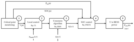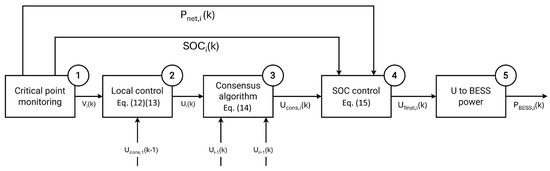 - A scalable control strategy that reaches consensus when voltage is regulated within the limits; thus, the algorithm is terminated as soon as voltage is regulated as opposed to when all batteries agree on the same amount of power contribution to the system,