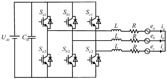 The two-level inverter, as a power converter, is widely used in new energy generation systems such as photovoltaic, wind power, and micro-grids [1,2]. Among control strategies for voltage source inverters, model predictive control (MPC) has been widely studied due to its advantages of control flexibility, reliable operation, and simple complementation [3]. Related improvement research focuses on reducing computational complexity, decreasing switching frequency, suppressing common-mode voltage, or reducing current harmonics [4,5].