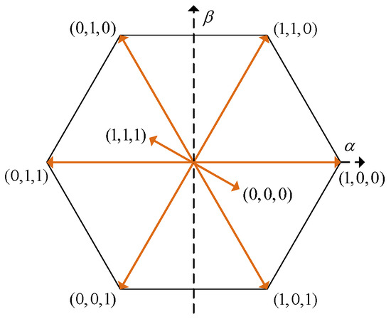 Figure 1 shows the topology of a three-phase two-level inverter. Here, is the DC voltage; L and R are the filter inductance and equivalent parasitic resistance, respectively; , , and , , correspond to the three-phase AC grid voltages and inverter output currents, respectively; () represents the switching states of the power devices. The two switching devices in each phase leg operate in complementary conduction. indicates that the upper switching device is turned ON, while indicates that the upper switching device is turned OFF. The valid combinations of these switching states generate eight distinct discrete space voltage vectors, as listed in Table 1, with their positions in the space vector diagram shown in Figure 2.