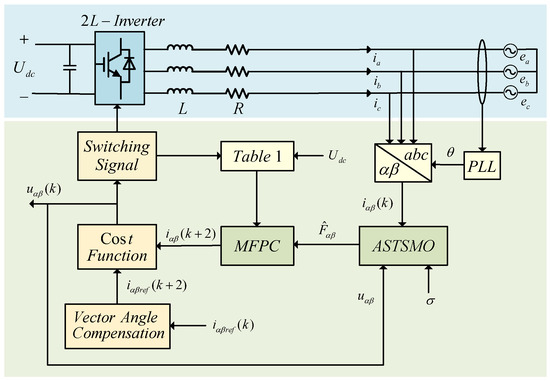 The cost function defined in (5) is still employed for receding-horizon optimization. In summary, the block diagram of the proposed adaptive super-twisting sliding mode observer-based model-free predictive control for inverter is shown in Figure 5.