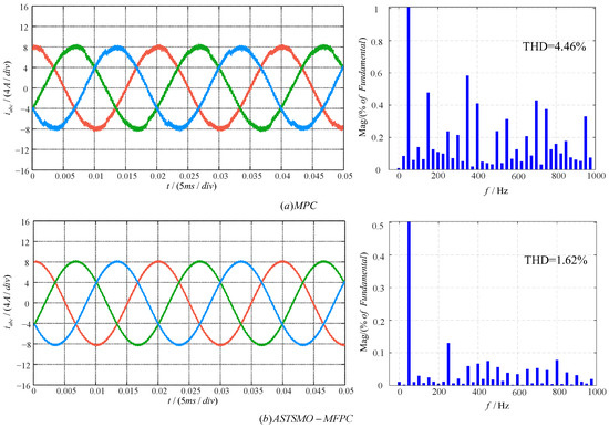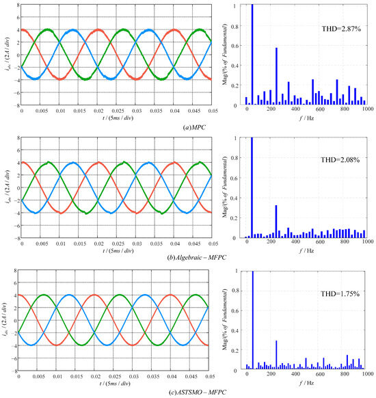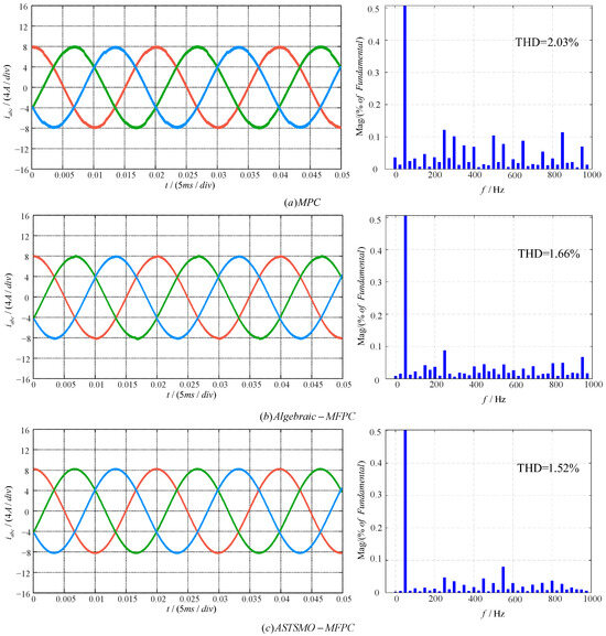 To validate effectiveness, the steady-state performance of the ASTSMO-MFPC was compared via simulations with MPC and Algebraic-MFPC. Figure 6 and Figure 7 present the output current waveforms and corresponding total harmonic distortion (THD) analyses for the three methods under parameter matching at reference currents with peak values equal to 4 A and 8 A, respectively. THD values under varying reference currents are summarized in Table 3.