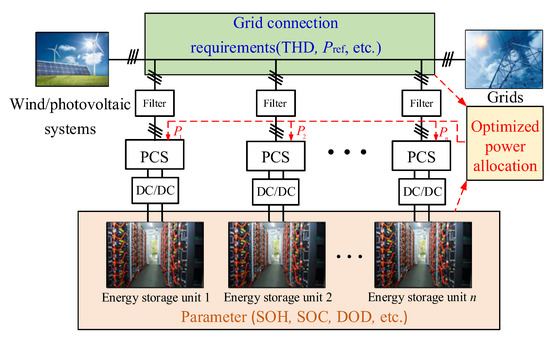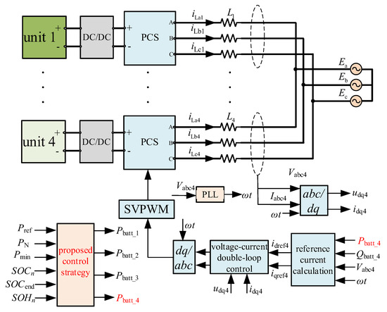 As shown in Figure 1, each PCS in the energy storage system operates independently without a shared DC bus, thereby eliminating zero-sequence current loops [23]. Consequently, when the PCS units output different power levels, there are no zero-sequence circulating currents between them. This configuration provides a foundation for optimizing power distribution among the energy storage units. Therefore, when the energy storage system meets the grid-connected power reference value (Pref), the power distribution among the PCS units can be optimized by incorporating both SOH and the operational metrics (SOC and DOD) of each storage unit, which in turn improves the safety and economic operation of the energy storage system.