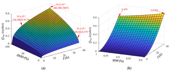 Battery lifespan variation diagram. (a) impact of DOD and current on battery lifespan; (b) impact of SOH and current on battery lifespan.