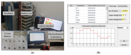Due to the limited resources of the experimental platform, the battery test platform is specifically designed for LiNiMnCoO2 batteries, as shown in Figure 3a. It meets the basic characteristics and testing requirements of lithium-ion batteries [27]. Various charge/discharge currents can be set during battery testing, as shown in Figure 3b. Therefore, this platform can be used to verify the effects of different charge/discharge currents, DOD, and SOH on battery lifespan. During the Reference Performance Test (RPT) of the battery, the maximum capacity of the battery is measured through constant current–constant voltage charging, with the constant current set at the C/25 rate, and the cutoff current for constant voltage charging set to 0.0001 mA. Some parameters of the experimental equipment are listed in Table 2.