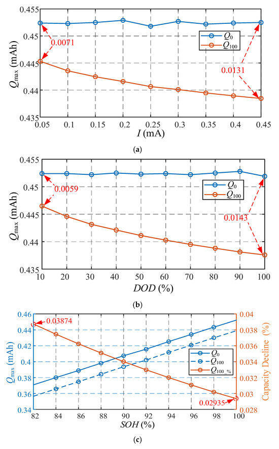 Nine new batteries with similar capacity differences were selected, and the DOD was set to 80%. Nine different battery current sets were designed, with current values increasing from 0.05 mA to 0.45 mA. After conducting 100 charge and discharge cycles on these nine batteries, RPT was performed. The maximum capacity change is shown in Figure 4a. The battery capacity degradation accelerates non-linearly as the charge and discharge current increases. Compared to a battery with a charge/discharge current of 0.05 mA, the battery with a current of 0.45 mA experiences a degradation rate difference of approximately (0.0131 − 0.0071)/0.0131 = 45.8%.