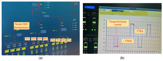 Inconsistency issues and current status of an actual energy storage station. (a) Inconsistent SOC status of an energy storage station; (b) charge/discharge current of energy storage station.