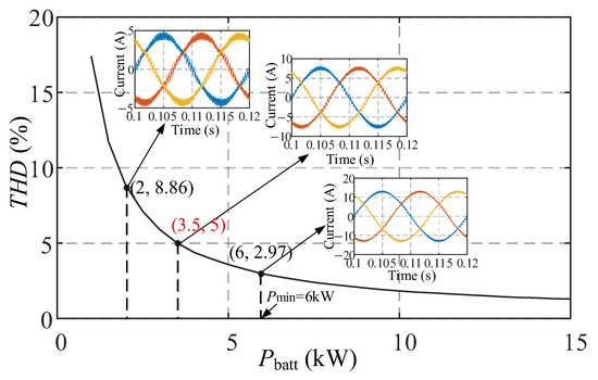 The power upper limit of the energy storage unit is set to the rated power of the PCS. For the power lower limit, according to the Total Harmonic Distortion (THD) expression in Equation (14), it can be seen that when the transmission power is small, the harmonic content on the AC side increases. For example, when simulating an energy storage system with a rated power of 15 kW, the variation of grid-connected THD under different output power levels is shown in Figure 6.