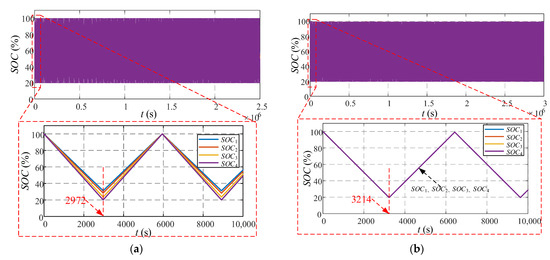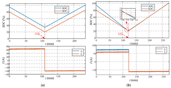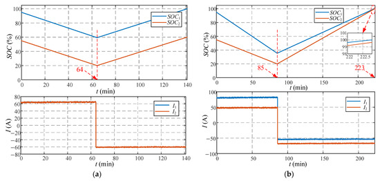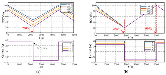 Simulation of strategies with large initial SOC differences. (a) Traditional strategy; (b) proposed strategy.