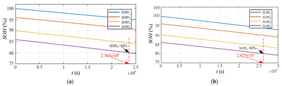 SOH variation under different control strategies. (a) SOC variation under traditional strategy; (b) SOC variation under proposed strategy.