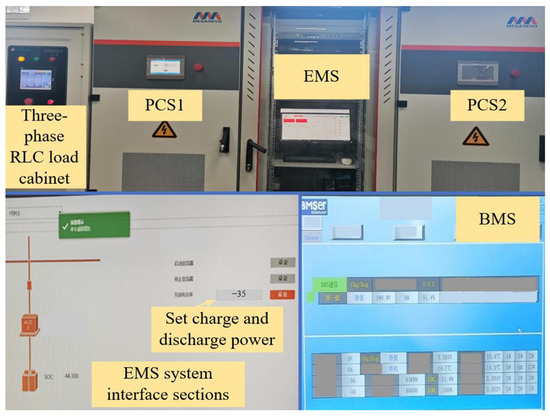 The energy storage power station experimental platform is shown in Figure 13. The total system capacity is 200 kWh, consisting of two 100 kWh LiFePO4 battery units. Each unit is controlled by a 50 kW energy storage PCS from MEGAREVO, Shenzhen, China. The PCS supports RS485, Modbus-TCP, and Ethernet communication interfaces and provides real-time voltage and current measurements as well as SOC estimation via an onboard algorithm, with voltage output accuracy of ±1% and SOC estimation error below 3%.
