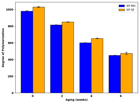 DP of MO- and SE-impregnated KP as a function of aging duration.