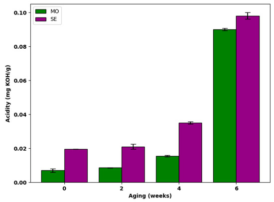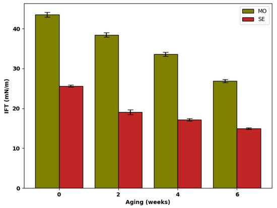 The experimental materials used in this study consisted of Kraft paper with a thickness of 0.25 mm, mineral oil (Nynas Nytro Polaris GX), Nynas AB, Stockholm, Sweden) and synthetic ester (Midel 7131, MIDEL & MIVOLT Fluids Ltd., Manchester, United Kingdom). The Kraft paper conformed to IEC 60554 [16], which specifies requirements for cellulosic papers for electrical purposes. The mineral oil is a high-grade inhibited transformer oil in compliance with IEC 60296 [17], while the synthetic ester is a biodegradable insulating fluid conforming to IEC 61099 [18]. Several conditions were tested: Fresh insulation and insulation degraded over 2, 4, and 6 weeks. The DP of the KP impregnated in both mineral oil (MO) and synthetic ester (SE) is shown in Figure 1. Figure 2 and Figure 3 present the IFT and acidity of the investigated liquids, respectively. Mineral oil has higher IFT than synthetic ester oil. This is because, in essence, mineral oil resists mixing with water more strongly, which creates a sharper interface and a higher IFT. Synthetic ester oils, being more polar and water-absorbing, blend more with water at the molecular level, softening that interface and reducing the IFT. As shown in Figure 3, a significant increase in acidity is observed after 6 weeks of aging. This rise could be attributed to intensified oxidation and hydrolysis reactions at this stage, especially in the presence of copper and residual moisture, leading to the formation and accumulation of acidic by-products such as carboxylic acids.