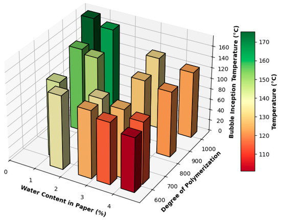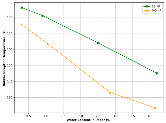 Bubbling Inception Temperature (BIT) represents the point at which gas bubbles begin to form, and it is a key parameter for evaluating the thermal stability of insulating materials [3]. It is influenced by factors such as moisture content, the aging state of the insulation, operating temperature, and the properties of both the insulating oil and paper. Higher moisture content reduces BIT by increasing internal vapor pressure, while insulation aging generally lowers BIT by reducing the energy required for bubble formation [3]. The chemical and physical properties of the insulating fluid, as well as the thermal and sorption behavior of the paper type, also play a role. For example, esters—being more hygroscopic than mineral oils—can dissolve more water and better resist bubble formation, and paper types, such as aramid and thermally upgraded Kraft (TUK), have different BIT characteristics compared to conventional Kraft paper (KP) [5,6].