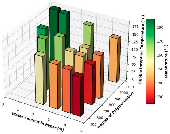 Similarly to mineral oil-impregnated KP, the BIT of synthetic ester-impregnated KP is evaluated across various aging conditions and WCP levels. A 3D bar chart, shown in Figure 5, illustrates the relationship between DP, WCP, and BIT for SE-impregnated KP. The relationship between DP, WCP, and BIT is rooted in the thermal stability and mechanical integrity of the insulation paper. The combined effects of reduced DP and increased WCP make the insulation system more vulnerable to bubble formation and potential electrical breakdown, emphasizing the need for the careful management of both factors to ensure the reliability of power transformers. The results for synthetic esters, however, show that even aged SE maintain a relatively higher BIT compared to aged MO.