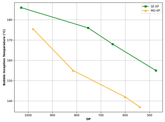 Data from Figure 4 and Figure 5 could be used to find the fitting formula of BIT for MO- and SE-impregnated KP. The fitting formulas are shown in Table 1. The pressure P in this study is 766 Torr. The proposed BIT equation is applicable for DP values in the range 1000–400 and WCP values in the range 0.5–5%.