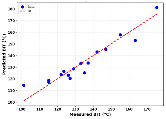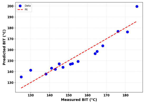 The fitted curves are compared with the experimental data, as shown in Figure 8 and Figure 9. These figures show a strong correlation between the measured and predicted BIT values, and this is especially true for MO-impregnated KP. The correlation coefficient (R2) for MO-impregnated KP is 0.904, which indicates a high degree of correlation and supports the robustness of the model for MO-insulated transformers. Although minor deviations are observed, most points closely align with the trend line, confirming the model’s predictive accuracy. For SE-impregnated KP, the R2 value is slightly lower at 0.864, suggesting a good but less strong correlation compared to MO.