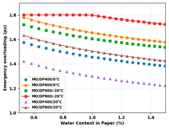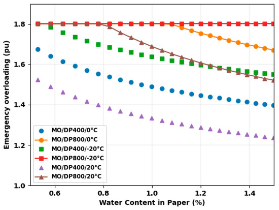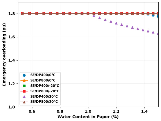 Figure 10 and Figure 11 present the values for MO and SE, respectively, across various combinations of WCP and ambient temperatures. The simulation considers two DP values (800 and 400) and three ambient temperatures (−20 °C, 0 °C, 20 °C), with the maximum load set at 1.8 p.u.